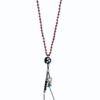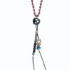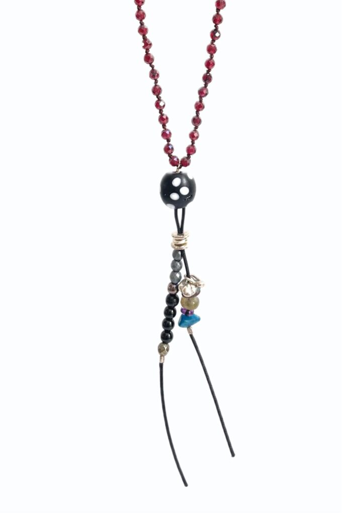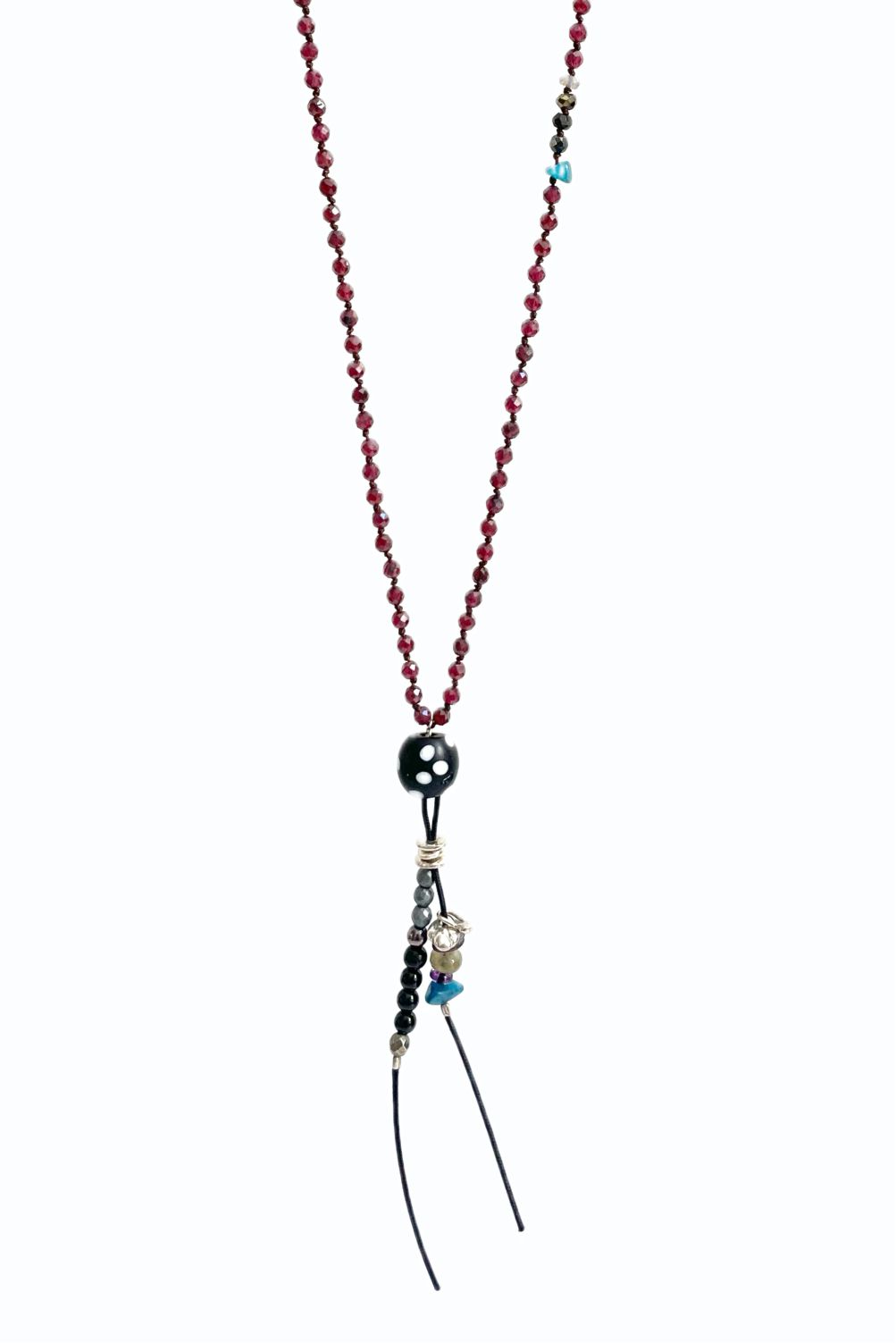 This necklace of fine garnet is hand knotted by the designer. This elegant piece featuring an old Venetian skunk eye bead with silver drop elements.
