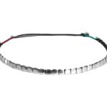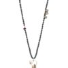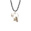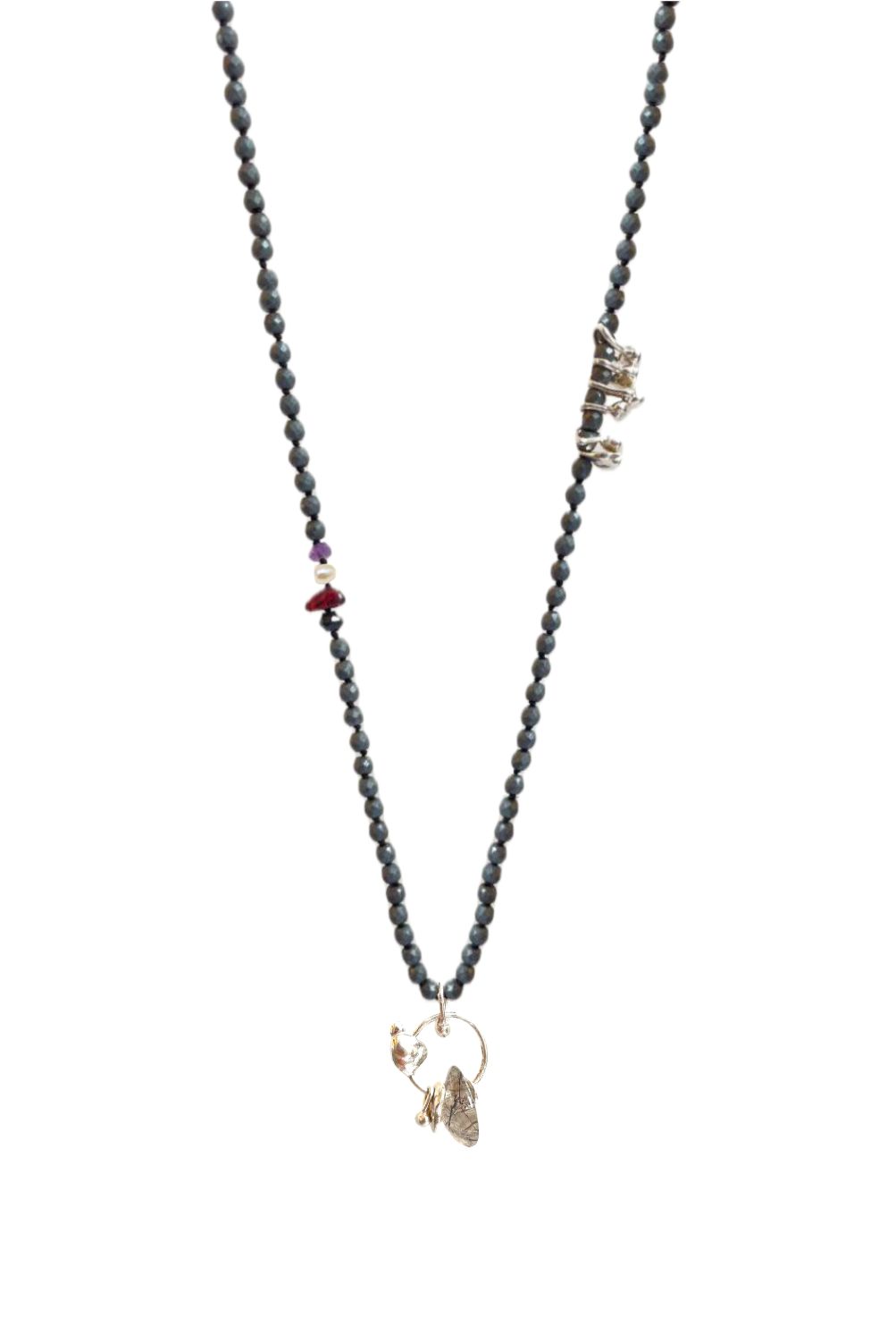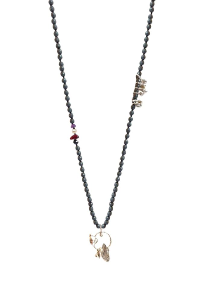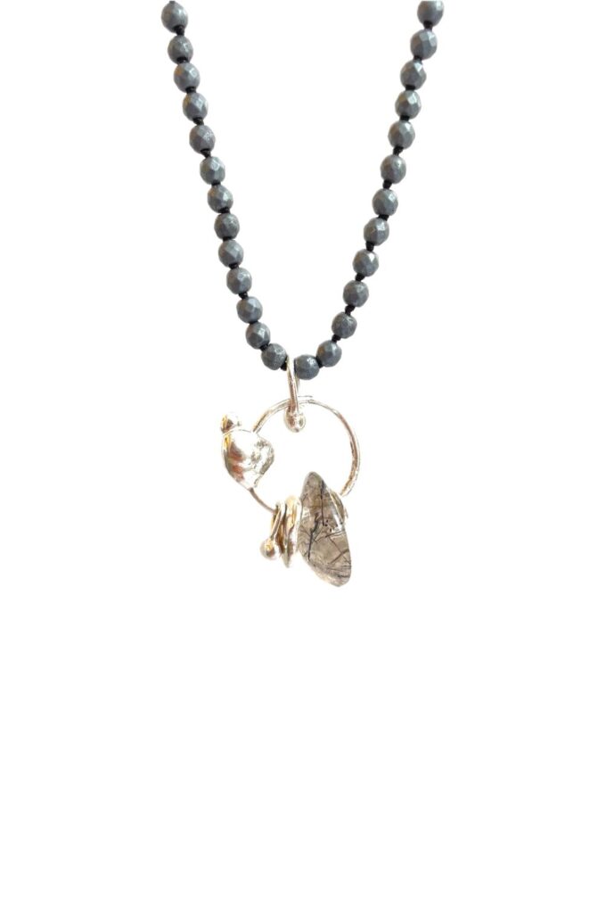 Hematite necklace on a silver ring with rutile quartz and silver drops details, hand knotted by the designer.