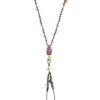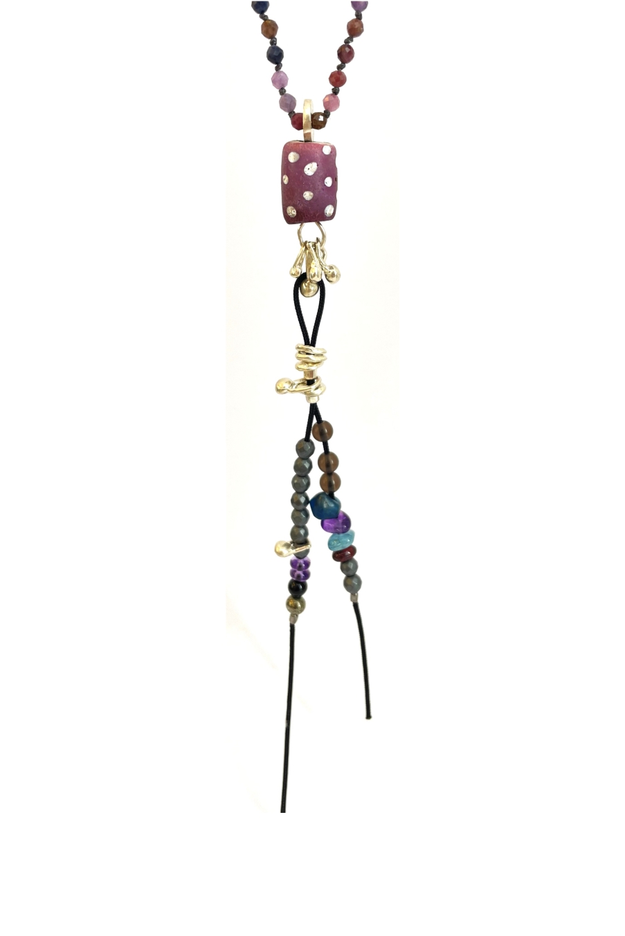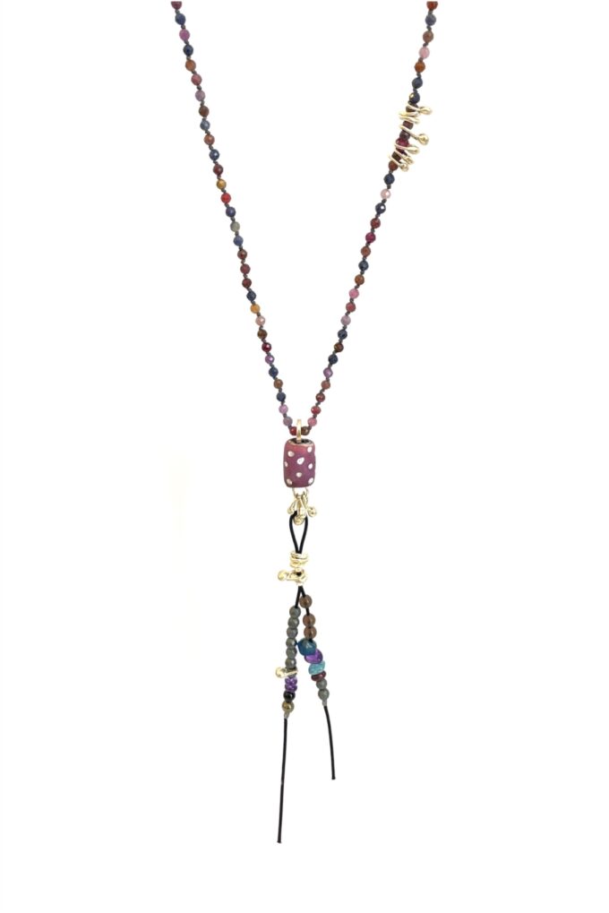 Fine multicolor sapphire with old venetian shunk eye bead necklace and silver drops details, hand knotted by the designer.