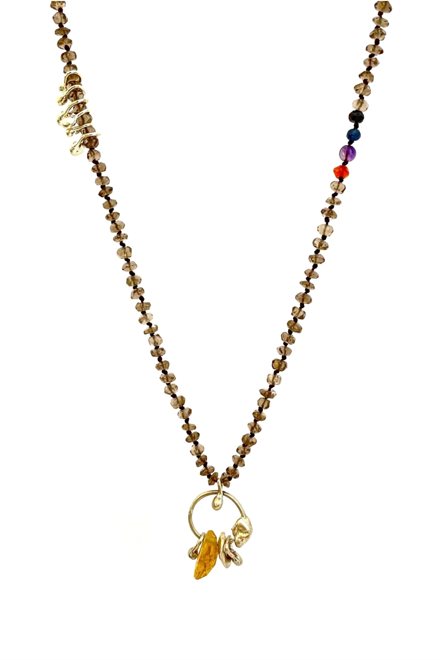 Fine smokey quartz with citrine necklace and silver drops details, hand knotted by the designer.